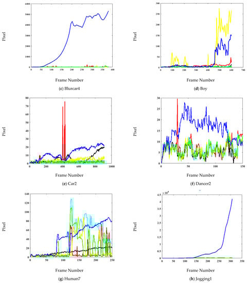 Figure 8 depicts the qualitative analysis of the proposed tracking with five state-of-the-art trackers. Modified KCF and KCF_MTSA are extensions of KCF [62] based tracking methods. However, Modified KCF is not robust to motion blur (Blurcar1, Blurcar3, and Human7), whereas the performance of KCF_MTSA is affected in occlusion (Jogging2) and motion blur (Human7). MACF is an improved version of fast discriminative scale space tracking [63] and achieved favorable results in various challenges of VOT. However, it does not perform well in motion blur (Blurcar1) and occlusion (Jogging1 and Jogging 2). MOSSECA is an improved context-aware formulation version of the MOSSE [64] tracker. The results are exceptional except in the Jogging1 and Human7 sequences. STC is the baseline tracker of the proposed method and achieves favorable results. However, it can be seen that it does not address occlusion (Jogging1 and Jogging2) or motion blur (Blurcar1, Blurcar3, Blurcar4, Boy, and Human7).