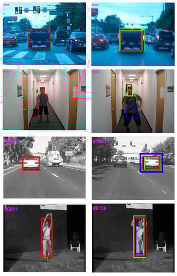 Visual object tracking (VOT) is an essential task in a variety of computer vision applications such as video surveillance [1,2,3], automobile [4], human–computer interaction [5], cinematography [6], sensor network [7], motion analysis [8], robotics [9,10,11], anti-aircraft system [12], autonomous vehicles [13], and traffic monitoring [14]. As presented in Figure 1, VOT remains a challenging issue due to motion blur, occlusion, fast motion, among others [15,16,17,18,19].
