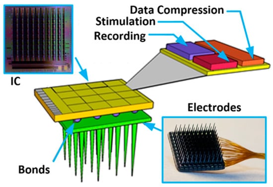 - Lopez, C.M.; Andrei, A.; Miltra, S.; Welkenhuysen, M.; Eberle, W.; Bartic, C.; Puers, R.; Yazicioglu, R.F. An Implantable 455-Active-Electrode 52-Channel CMOS Neural Probe. IEEE Int. Solid-State Circuits Conf. 2013, 49, 248–261. [Google Scholar] [CrossRef]
