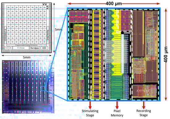 This paper aims to provide a possible solution that can be implemented whenever the abovementioned requirements need to be satisfied in the multichannel systems dedicated to different types of biomedical experiments. The proposed solution is a result of the author’s former works [,,,,,]. The paper is organized as follows. Section 2 provides information regarding the 100-channel integrated circuit (IC). Section 3 and Section 4 provide the design description of the recording and stimulating blocks, with an emphasis on their main parameter uniformity. Section 5 consists of the ICs’ parameters measurement results and neurobiological recording results, while Section 6 provides conclusions.
