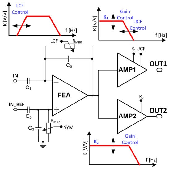 The recording channel is dedicated to performing proper amplification and filtration of weak input biomedical signals to optimally utilize allowable supply voltage and to condition signals for following blocks, such as analog to digital converters. There are many excellent examples of integrated electronics dedicated to biomedical signals recordings [,,,,,,,]. These very often utilize additional techniques to overcome problems with noise and power consumption (such as chopping, sigma-delta conversion, ad digital feedback), and promoted results are outstanding. Here, the additional aspect is considered, i.e., main parameter uniformity from channel to channel, ICs’ functionality, and their area occupation that may be important whenever large functionality on a small area is considered [,].