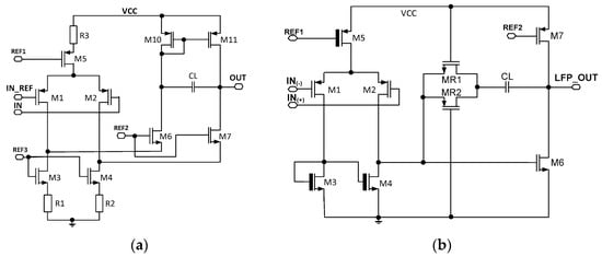 So as to estimate the UCF spread from channel to channel, a detailed analysis amplifiers architecture needs to be performed. In the following project, two core amplifiers are utilized and these work for front-end amplifier and amplifiers AMP1 and AMP2. The core amplifiers are presented in Figure 4. Since the three UCF spread factors analysis (Equation (10)) is very similar in both amplifying stages, only the front-end amplifiers’ UCF uniformity will be analyzed (Figure 4a).