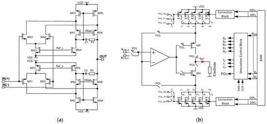 The schematic idea of the current stimulators’ core amplifier (a) and schematic idea of the programmable current stimulator (b).