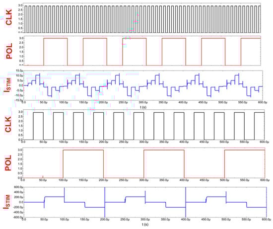 The stimulator idea is based on the proper selection of two parameters, i.e., voltages VCTR_C/VCTR_A and resistances REQ_C/REQ_A, where VCTR_C and VCTR_A are voltages provided to the amplifiers’ input during one of the stimulation phases (cathodic or anodic current generation, respectively, controlled by the POL signal), while REQ_C/REQ_A is equivalent resistance during cathodic/anodic phase (Figure 6). To save power and silicon area, there is only one operational amplifier used that is built of rail-to-rail input stage (Figure 7a).