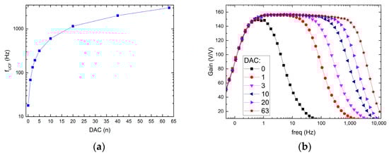 The possible recording channel configurations are shown in Figure 9 and Figure 10. It can be seen that the LCF can be controlled in one of two ranges, i.e., in the 10 Hz ÷ 1 kHz range, or the 300 mHz ÷ 30 Hz range. Importantly, thanks to the fact that the particular pixel is equipped with its 6-bit DAC, the LCF may be tuned individually. The UCF can be controlled globally in the 20 Hz ÷ 3 kHz range. These results show that the thick oxide transistors usage in the second stage of the recording path (AMP1) (see Figure 4b) allowed for the decrease in current supplying the amplifier down to a few pA in each of the recording channels.