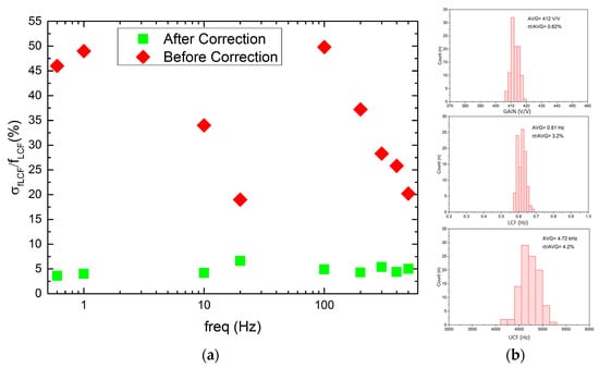 LCF spread from channel to channel before and after correction for a given LCF setting (a) and voltage gain, LCF, and UCF histograms (b).