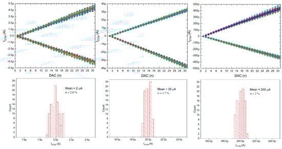 The current stimulators were also verified (only static verification was conducted, these were not used during the neurobiological experiments), and it can be seen that the stimulating currents can be controlled with 32 equal steps in three different current ranges: 0 ÷ ±5 µA, 0 ÷ ±25 µA, and 0 ÷ ±450 µA (see Figure 13). These current ranges can be changed individually, as the POL_N/POL_P voltages are globally controlled by six 6-bit DACs located below the chip matrix. Noticeably, thanks to the in-pixel individual correction, the uniformity of the stimulating current can be as low as 2.6%.