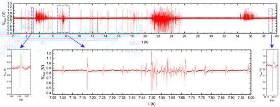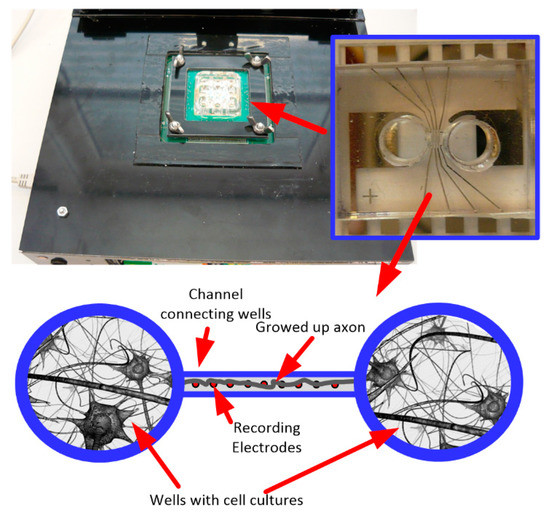 The presented IC was also used in the neurobiological experiment performed in collaboration with Qwane Biosciences SA, Lausanne, Switzerland, that conducted extensive research under the NEUROACT project [] The idea of this experiment was to produce a first feasibility study of the measure of neuronal signals propagation speed along isolated axons. The motivation of this experiment was to find a way that allows studying the propagation characteristics of neuronal signals along axons, as the impairment of axonal propagation is often a consequence of neurodegenerative diseases. This approach could lead to a platform for drug screening applications whereby neuronal protection or recovery could be monitored by the propagation speed along the axons. Therefore, to perform this experiment, the 256 channel in-vitro recording platform [] was adapted to a specially developed Micro-Electrode Array (MEA) device (see Figure 14)—the few pixels were combined with existing recording electrodes, and the exemplary recordings are presented. The MEA is composed of two small culture wells measuring 3 mm in diameter, connected by a microchannel (10 µm wide, 3 µm high, and 1 mm long), allowing only neuronal axons to cross it. The recording electrodes (10 µm × 50 µm) are located at equidistant positions along the microchannel and not in the culture chambers as they typically are in MEA devices. The experiment may be started just after the neurons establish their well-to-well connection with the axon, which takes approximately 10–14 days [,]. The Figure 15 shows the neurobiological signals recorded during this experiment. Compared to standard MEA devices, obtained single spike amplitudes are much larger in our chip configuration (up to 700 µV instead of typical 50 µV ÷ 100 µV), which is due to the small volume of the microchannel in which the axons are located. As can be seen in the recording, different signal amplitudes are recorded during the experiment. These different signals correspond to different individual axons crossing the microchannel.
