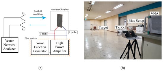 The experiment was conducted by connecting Anritsu’s MS4640B vector network analyzer and two horn antennas with a gain of 15–18 dBi in X-bands, one to transmit and the other to receive the signal reflected from the target. Throughout the experiment, the distance between the antenna and the target was maintained at approximately 5 m, which satisfies the far-field condition. For the measured signal, only the reflected signal of the target was selected through time gating, and the RCS was calculated through post-processing. In this experiment, the RCS of the target can be calculated by the following equation [].