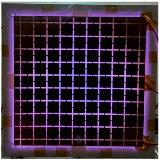 Figure 2 shows the final fabrication of the proposed DBD generator with an FSS electrode. Plasma is generated when a voltage higher than the breakdown voltage is applied between the electrodes and the ground. In this study, plasma was generated at 0.3 atm, the atmospheric pressure at 30,000 ft (approximately 9.1 km), which is the altitude where an aircraft operates.