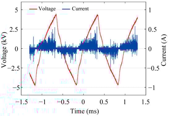Figure 4 shows the optimal plasma generation form of the fabricated DBD generator. At this time, the plasma was generated at a driving frequency of 1 kHz and an applied peak-to-peak voltage of 8 kV. With a further increase in the applied bias voltage to peak-to-peak voltage of 10 kV, a stable plasma was generated throughout the generator. The discharge voltage and current of the plasma generator measured is shown in Figure 5. The measured peak-to-peak voltage was 8.9 kV, which was slightly reduced compared to the applied voltage because of the loss resulting from the use of a high voltage amplifier. The calculated average power consumption for generation of the plasma is 80.5 W.