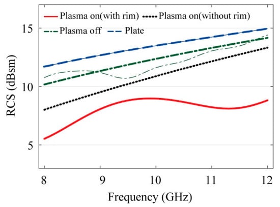 Figure 7 shows the measured RCS of the 200 × 200 mm2 copper plate and when the proposed DBD generator is attached to this plate. The figure also shows the changes in the RCS when the plasma is generated, with and without the dielectric rim. Results reveal that by attaching the FSS-based DBD generator to the plate, RCS is reduced by as much as 1.5 dB. When a bias voltage is applied and the plasma is generated, the RCS is reduced further by as much as 2.2 dB. Finally, with a dielectric rim, an additional of 2.4 dB of RCS reduction effect is measured. The RCS of the copper plate decreased over the entire X-band, with an average reduction of 5.4 dB. The maximum reduction was 6.4 dB at 11.5 GHz, and the minimum reduction was 4.3 dB at 9.5 GHz.