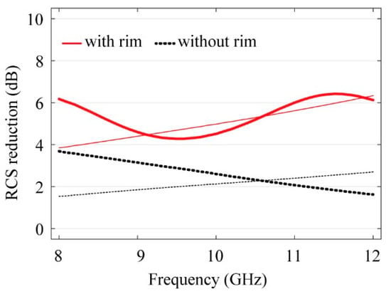 Comparison of RCS reduction effect of proposed DBD: with and without dielectric rim. Measured (thick) and simulated (thin) results based on the Drude model using CST [].
