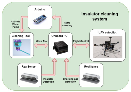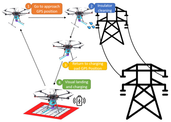 The main goal of this work is to develop an autonomous UAV system for insulator cleaning in power lines as shown in Figure 1. First, the system uses a global positioning system (GPS) point to approach the target area. Then, a vision algorithm using a convolutional neuronal network (CNN) provides the location of the insulator to control the UAV. The cleaning tool aims and shoots a water jet on a point sequence given by an algorithm with a semantic segmentation neuronal network that detects the soiled areas of the insulator. The maximum payload that the UAV can carry will be mostly used for storing the cleaning liquid. For that reason, the tool developed for cleaning the insulators has been designed to minimize weight. When the battery or liquid tank level is low, the system returns to the charging pad. Finally, a vision-based algorithm for autonomous landing on a charging pad has been developed. The overall system structure can be seen in Figure 2.