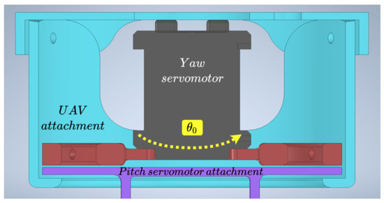 One of the main elements to prevent a breakage of the yaw servomotor and maintain its performance is the red part in Figure 4, which holds the servomotor. The movement is transmitted to the purple piece, and as can be seen, if there were torsional moments, the blue piece that surrounds the previous ones would prevent the possible breakage of the servomotor. The purple piece at the bottom is the one that holds the cleaning tool to the UAV. This system has four silicone dampers, which connect the UAV body with the pointing tool, to avoid excessive vibrations between the UAV and the tool.