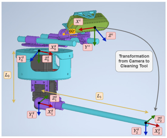 To move the described system, an analysis of its kinematics was carried out. The direct (1) and inverse (2) kinematics were obtained using the Denavit–Hartenberg method [24,25]. The scheme used can be seen in Figure 5, and the parameters are shown in Table 1. These parameters were applied to obtain the direct kinematics of the tool, which is used to know the transformation from the camera to the end-effector. In the equations, , and are the joints that control the yaw and pitch, and is the position of the end-effector from the tool coordinate frame.