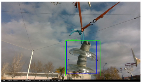 Insulator detection using YOLO v4 Tiny with TensorRT implementation (green bounding box) and tracker result (blue bounding box).