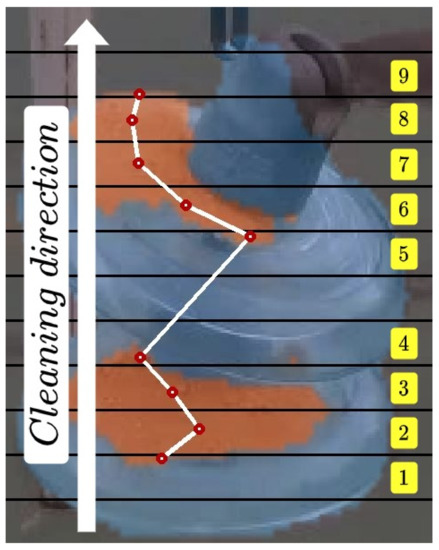 Using the segmentation mask obtained from the network, a system that defines the path to follow by the cleaning tool was developed. To generate this path, the image resulting from the segmentation of the soiled areas has been divided into equal horizontal segments as can be seen in Figure 8. The centroids of these divisions are used alongside the aligned depth image to obtain the points to be followed by the tool. This algorithm is performed online at a rate of 40 ms, so these points and the path calculated dynamically change during the cleaning operation. The points delivered to the cleaning tool are fed from the bottom up, as the cleaning of electrical equipment is carried out in this way.
