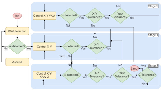 The first stage detects the landing station for the first time and controls the UAV to center the target in the X–Y plane. When the UAV has succeeded in reducing the distance to the center of the platform by a threshold, it continues to the next stage. The second is used to align the UAV with the platform by adding to the control a yaw rotation. The third stage initiates when the X–Y distance and yaw rotation thresholds are reached. Then, the descent maneuver commences while keeping the platform centered and aligned, controlling four DOFs. If any of the conditions are not fulfilled, the system will return to the previous stage until they are satisfied. When the distance to the platform is less than 50 cm on the Z-axis, the landing is performed. The limits set for switching between stages are dynamically calculated depending on the height of the UAV.