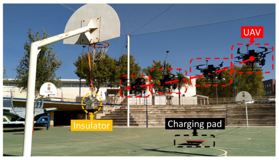 The application relies on the ability of the UAV to charge itself, since cleaning multiple insulators would drain the battery. Therefore, a platform that integrates a commercial charging pad [30] has been designed and built. The platform is designed to be clearly visible from a high altitude to facilitate landing, as shown in Figure 9a.
