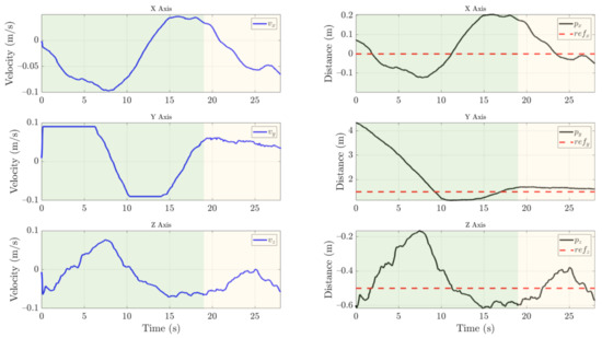 Visual control of the UAV with the control signal (blue line), position estimation of the insulator (black line), and reference (dotted red line). Once the insulator is detected, the UAV performs the approach phase indicated by the green area. When the UAV is stabilized on the three axes below a threshold for three seconds, the cleaning phase indicated by the yellow area begins.