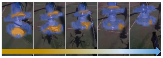 Then, during the cleaning phase, the targeting and cleaning system is capable of performing the task while the UAV compensates for the weight dumped from the cleaning liquid tank. The drift in the X-axis and Y-axis is less than 30 cm. Moreover, the insulator is always in sight, and the tracking that feeds the position control is stable.