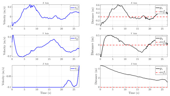 The control signal and the position of the insulator can be seen in Figure 13. First, the insulator is detected at a distance of 4.5 m on the Y-axis and the UAV starts the approach maneuver, saturating the forward velocity. On the X-axis, an overshoot of at most 20 cm of error, which is within the reach of the cleaning tool, occurs. When the visual control manages to stabilize the UAV between an error of 20 cm on the X-axis, 30 cm on the Y-axis, and 10 cm on Z-axis for 3 s, the cleaning phase starts.
