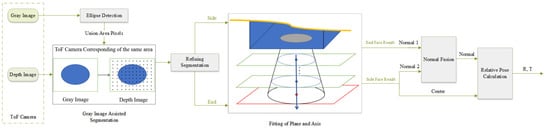 Therefore, image-assisted point cloud segmentation methods are considered []. The gray image and depth image of the ToF camera share one optical imaging system and have the same camera parameters. Gray and depth images are associated by pixels, one-to-one correspondence, which avoids the complex registration between two types of sensors and data. In addition, the ToF camera can keep constant accuracy in the range measurement as the target distance varies. In this paper, we will investigate the above problems using a ToF camera and propose a fast segmentation method using the gray image to assist point clouds according to the characteristic of the ToF camera and some tricks, which solve the problems of large segmentation scale and structure occlusion caused by direct segmentation of point clouds, as well as the problem of ellipse detection errors due to shadows and multiple circles in gray images.
