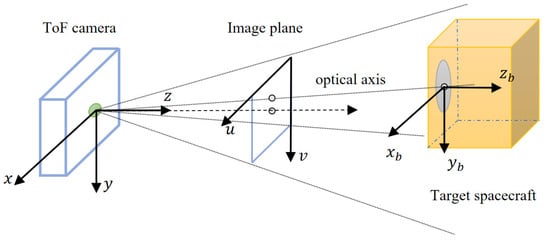 In this paper, the relative pose of the target spacecraft with a circle feature on the surface is measured by using the depth image and gray image of the ToF camera. To facilitate calculation and conversion, the following coordinate system is defined as follows (Figure 4):
