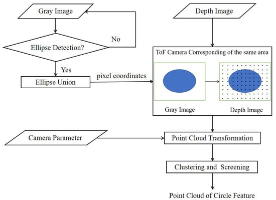 Firstly, an ellipse detection algorithm is used in the gray image, and the results are taken to form a union, which ensures that the region contains as many circle feature structures as possible. The ToF camera parameters are used to transform the depth image to a small-scale point cloud obtained from the corresponding region containing a circle feature structure. After further simple denoising and segmentation, the point cloud of the circle feature area can be obtained.