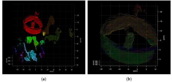Direct segmentation result of point cloud. (a) the result after the planar background segmentation; (b) the result after the clustering segmentation.