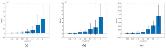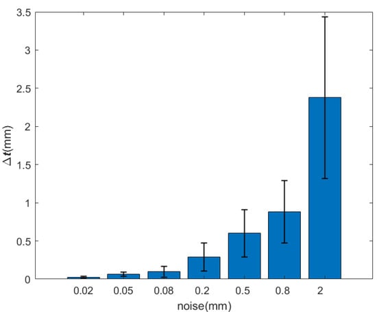 It can be seen from Table 2 and Table 3 and Figure 16 and Figure 17 that, when the observation model is added the noise of the order of 0.01–1 mm (the point cloud resolution is on the order of a millimeter), the errors of Euler angle and displacement increase with the increasing of the noise. However, the Euler angle always maintains high accuracy, whose total attitude angle error is within 0.1 and the fluctuation range is within 0.1. With respect to the displacement, when the noise is on the order of a millimeter, the error and fluctuation range is within several millimeters. With the noise under millimeter order, the accuracy can reach sub-millimeters or even higher. It can be seen that the relative pose solution method based on the circle feature point cloud has higher accuracy and better robustness under strong noises.