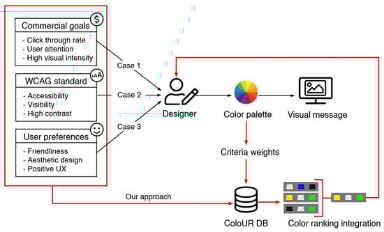 A designer must take numerous factors into account. On one hand, their work represents the implementation of their creative vision, while on the other hand, business requirements, standards, and technological limitations must be considered. The fulfillment of business targets is measured by the attainment of a high click-through rate (CTR) [11] through the use of visual design to attract the user’s attention, especially in the color domain (Case 1). Trends, as well as standards, such as the WCAG, impose visual design adjustments on different social groups by, e.g., limiting the color palette to colors with a high contrast factor (Case 2), whereas the user follows their preferences and expects a friendly and aesthetic visual message, which is simultaneously legible and comprehensible (Case 3). Thus, the search for a solution that balances user preferences, the attraction of user attention, and the fulfillment of WCAG standards takes place. The used dimensions are subjective data, objective measurements, and color contrast. Data collected during the experiment are stored in a knowledge database, called ColoUR DB (Color User Response Database). The designer decides which criteria are relevant for a given visual design and adjusts their weights appropriately. Based on the designer’s settings, a color ranking is generated. It is possible to obtain a color ranking for each separate criterion as well as an integrated one that covers all designers’ settings. The results were used to develop and implement a tool for designers, which we call The ColoUR Balance Tool.