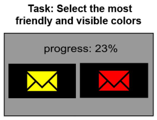 The forced-choice method. In order of the forced-choice pairwise comparison procedure, the observers are shown a pair of images (with the same primary color—background and different secondary colors—pictogram) and are asked to indicate the more eye-catching image (see Figure 2). Observers are always forced to choose one image, even if they see no difference between them (hence the name “forced-choice”). There is no time constraint within which one must make their decision. The method is popular, but it is highly tedious if a large number of images need to be compared. However, as reported in [23], this approach results in the smallest measurement variance and thus produces the most accurate results in comparison with other metrics used as standard in perceptual experiments, such as single stimulus, double stimulus, or similarity judgment [23].