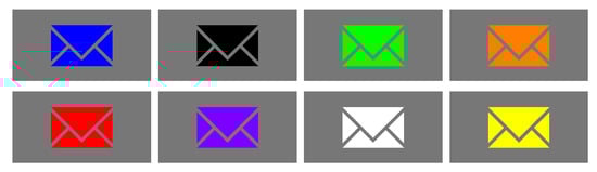During the experiment, users evaluated nine primary colors: black, gray, green, blue, violet, red, orange, yellow, and white. Each primary color was fixed as a background, and the remaining colors were set as secondary colors, i.e., foreground—pictogram (see Figure 3). The goal was to investigate whether a change in the primary color influenced user assessment of user-friendliness and visibility (subjective data). Together with the collection of user preferences, the user’s eye movements were recorded by the eye-tracker (objective data). The aim was to investigate, as above, whether a change in the primary color influenced user attention attachment and to measure the difference between subjective and objective user responses.