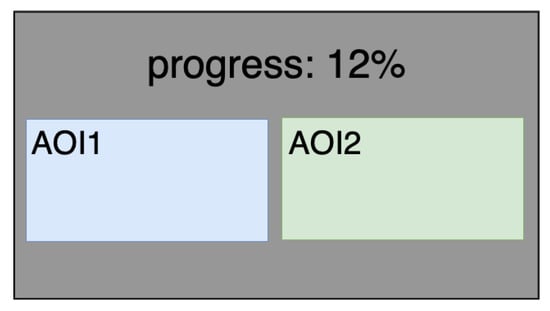In our research, our focus was on the color combination that first attracts the user’s attention. As the very first impression is measured by the time to the first fixation, we used it for further analysis. This metric was measured just after the pair of images was displayed, and the image that first attracted the user’s attention was determined. To conduct the eye-tracking analysis, we defined two areas of interest, AOI1, and AOI2, for which the metric “time to first fixation” was computed (see Figure 4). Every image from the displayed pair of images was associated with one of the defined areas of interest (AOIs).
