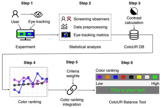 The schema shows the research procedure. The experiment with user participation allowed us to collect data on the time to first fixation for color pairs. The collected data were subjected to statistical analysis, resulting in the formation of the ColoUR DB. The ColoUR DB contains data on the natural eye fixation of users on color pairs and a contrast calculation for the same color pairs. Color ranking is based on parameters entered by the designer, i.e., criteria and their weights. The ranking can be generated for each criterion or in an integrated form. The research result is a tool for designers—the ColoUR Balance Tool.