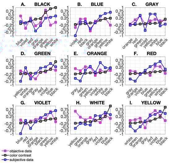 Color rankings for primary and secondary colors were developed based on ColoUR DB. The figure depicts the results for 9 tested colors: (A–I). The color ranking is arranged according to the level of user eye attraction. Each graph only applies to a single primary color, for example, (A)—Primary color Black. On the X axis, there is a set of secondary colors. The Y axis represents normalized values obtained in the experiment. Each graph shows tree plots. The first one (magenta) shows objective data recorded by an eye-tracker. The second one (black) shows a contrast calculation for the same color pairs. The contrast was determined according to the WCAG standard presented in the Methods section. The third one (blue) shows subjective data coming from users’ responses obtained during the experiment, as presented in the Results section.