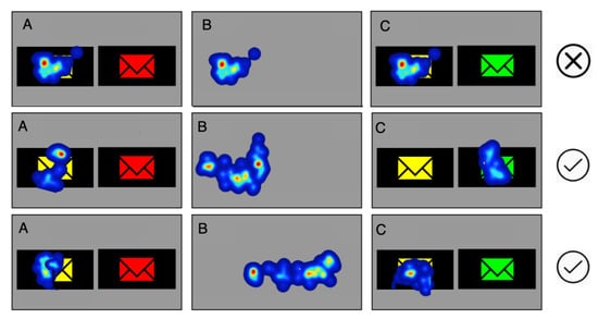 Attracting eyesight to the displayed stimulus. (A)—first slide, (B)—empty (middle-gray) screen (2 s), (C)—next slide. Top: situation where the eyes remain on the picture following the previous task. Middle and Bottom: eyes naturally resting on the image after the stimulus is displayed. To avoid situations where the user’s sight remains on the stimulus of the previously performed task and changes are noticed between images displayed one after another, an empty gray screen was shown for two seconds.