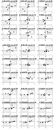The color rankings shown in Figure 6 represent the main result of the performed research. The color ranking is ordered by contrast values. Results are presented for primary colors A through I and linked to a set of secondary colors (X-axis). All data are standardized and normalized. Discrete values are connected by a line for better data visualization. The results indicate a high level of asymmetry in human behavior. Subjective and objective data provided from the same user were found to differ dramatically. To check the dependence between the data, the Kendall correlation was computed. The Kendall correlation results are depicted in Figure 8 (Top) and in Table 1, where the correlation value and significance level p are recorded. The mean Kendall correlation was equal to 0.2460, and the statistical significance was not lower than the threshold of 0.05 for any of the primary colors. This means that the data are quite different. The results show the asymmetry as well the visibility of objective data and contrast values, as shown in Figure 8 (Middle). Here, similar to above, the mean Kendall correlation was low and equal to 0.2263, and the significance level is above the 0.05 threshold. This means that WCAG standards do not correspond to the natural eye-catching mechanism. The biggest similarity was between the subjective data and contrast (see Figure 8 (Bottom)). Here, the mean Kendall correlation was equal to 0.60. This value is not particularly impressive, but for 6 of the 9 primary colors (blue, green, red, violet, white, and yellow), the Kendall correlation significance level was lower than 0.03. This means that the influence of the WCAG standard on visibility is consistent with user preferences.