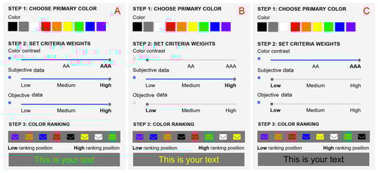 where a is the color contrast criterion, b is the subjective data criterion, c is the objective data criterion, and , are criteria weights. Criteria weights can be set to one of four levels, and . For the color contrast criterion, has the following categories: means that the criterion is disabled and does not participate in color ranking generation; means that the WCAG standard has not been fulfilled; means that the WCAG standard is fulfilled at the AA level; and means that the WCAG standard is fulfilled at the AAA level.