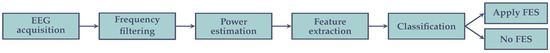 Typical BCI acquisition chain. After acquiring the EEG signal, the frequency components outside the band of interest are filtered out. Then, the power of the signal is estimated, followed by the extraction of its features to be used to classify if FES needs to be applied or not.