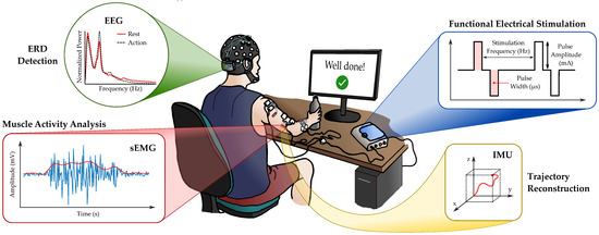 Considering the central role of EEG in analyzing the brain response to AOT [63,64,65], a brain–computer interface (BCI) could be developed to control the FES application according to a specific EEG activity [66,67]. In particular, depending on the subject possibilities, the control could be based on both motor imagery (MI) [68,69] and movement execution (ME) approaches, which have been demonstrated to activate almost the same cortical regions [17]. Either way, similarly to AO, an activity change of the mu and beta EEG waves, known as event-related desynchronization (ERD), is induced [70]. However, considering the difficulties related to MI (e.g., long training is required to command the BCI, and it is impossible to assess the correctness of mental training [27,71]), ME has been identified as a more reliable technique for the implementation of the FES control, considering that it includes both motion preparation and actuation phases, thus covering the whole execution process. Although other physiological signals could be used as BCI inputs (e.g., visual stimuli [72]), AO, MI, and ME approaches have been proven to be more beneficial in neurorehabilitation, because the combination of simultaneous cortical activity and muscle stimulation significantly promotes neuroplasticity [73,74].