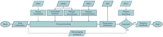 An active control of the FES application could be implemented by monitoring and processing the neurophysiological signals that are the most descriptive of the planning and execution of the movement. Indeed, by assessing the electrical activity of the central nervous system at certain brain regions (e.g., premotor cortex, primary motor cortex), which is known as ElectroEncephaloGraphy (EEG), or by supervising the contraction of the skeletal muscles, represented by the ElectroMyoGraphic (sEMG) signal, bio-mimetic FES-controlled systems have been realized [60,61,62].