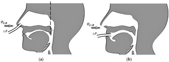 The method of posterior active rhinomanometry involves the placement of a point for measuring the pressure in the nasopharynx (see Figure 1b) using a tube placed in the mouth with the lips tightly closed. The distal edge of the tube should not cause the studied vomiting reflex, which is especially important when examining pediatric patients. To perform this method, the patient may need to become accustomed to performing breathing maneuvers through training. This measures the total air flow QL+R and the pressure difference Δp between nasopharyngeal and atmospheric pressure, taking into account the area of the epipharynx. Despite certain methodological difficulties, this method actually allows the study of nasal breathing in the physiological conditions as close as possible to realism (real ones) and to test nasal breathing in (the) forced mode [,].