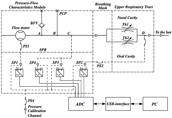 Combined scheme of a computer rhinomanometer TNDA (PSP—pressure control point, BFV—check valve adapter, Th1 and Th2—parallel adjustable throttles (resistances), SP1-SP4 pressure transducers, PS1–PS4—flexible hoses).