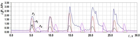 Let us consider the features of posterior active rhinomanometry and cyclograms of nasal breathing. Typical cyclograms of nasal breathing during posterior active rhinomanometry are shown in Figure 4. It should be borne in mind that measurements according to the rhinomanometer diagram shown in Figure 2 are carried out in the inspiratory phase, as evidenced by a zero reading of the p4 transducer and a nonzero value of the pressure on the p1 transducer, set in a flow sensor of the Venturi nozzle type. The pressure readings on the SP1, SP2, SP3 and SP4 pressure transducers will correspond further in the text and in the diagrams to the values p1… p4 ().