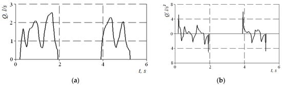 Graphs of the air flow signal in two respiratory cycles when inhaled according to the forced dynamic PARM (a) and derived from the air flow time (b).