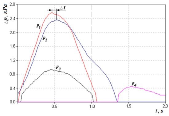 Regarding the example of the respiration cyclogram (see Figure 7) and given that Δϕ and Δt, we can determine that the time shift Δt between the maxima of the pressure difference p2 signals in the nasal cavity and the pressure p1 in the flow meter is 0.05 s, which corresponds to the phase shift between signals δ = 9°. However, determining the statistical significance of this indicator in the diagnosis of diseases of the upper respiratory tract requires further study and medical justification depending on, for example, the condition and humidity of the mucous membrane of the nasal cavity.