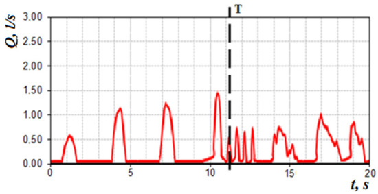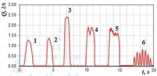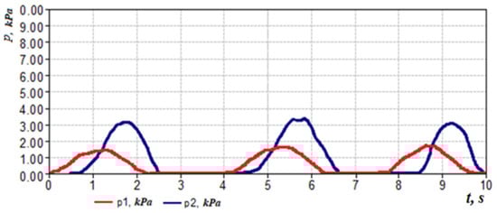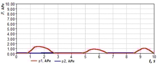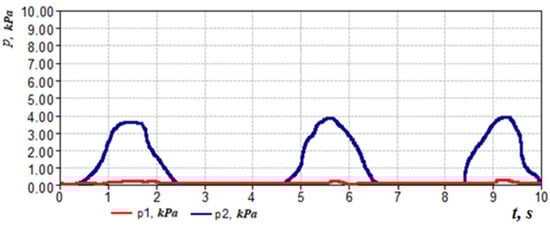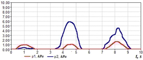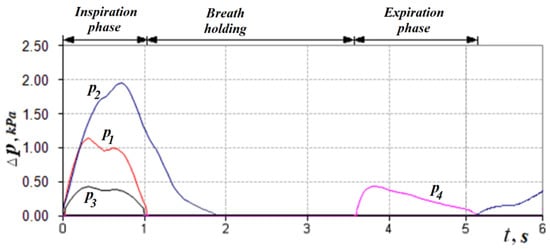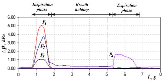 In accordance with the above design features, in the inhalation phase (see Figure 4, Figure 8 and Figure 9), which is fixed by the non-zero value of the pressure transducer p1 installed in the flow meter based on the Venturi nozzle, the pressure signals of the transducers p1, p2 and p3, and that record the vacuum, reach their maximum value; while holding the breath, the signals of all transducers are equal to zero. The expiratory phase is recorded by non-zero readings of the pressure transducer.